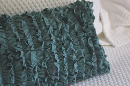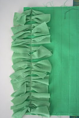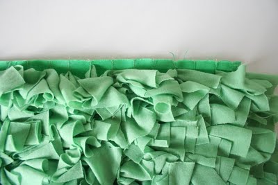 A párnahuzatot 2 cm-ként bevonalazzuk, majd az összes vonalra rávarrjuk a jersey anyagot ráncolva! Végül a párna 3 oldalát összevarrjuk a negyediken pedig betöltjük, majd kézzel ezt is összevarrjuk.