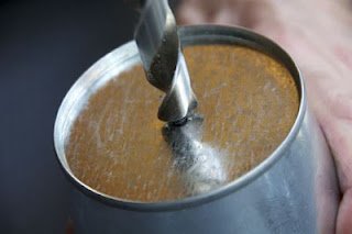Mindegyik vödör közepére fúrjunk egy kb. 1,5 cm átmérőjű lyukat.