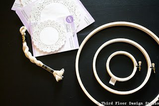 A tortapapír szélén fűzzük át a cérnát vagy damilt és kössük a hímzőkeretekhez.