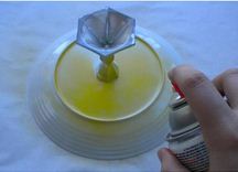A gyertyatartót ragasszuk a tányér aljához, majd ha fújjuk le porcelánra is használható spray festékkel!