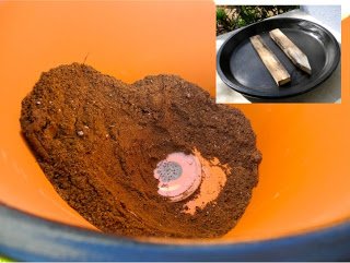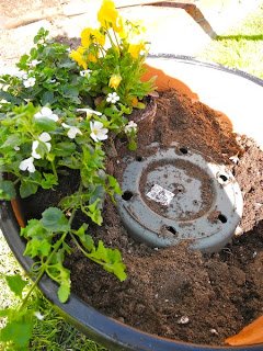 Tegyük a műanyag doboztetőt a legnagyobb cserép aljára majd töltsük fel földdel.