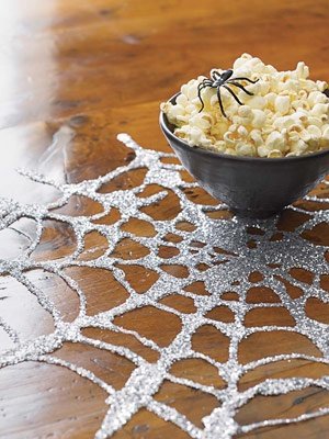 A sütőpapírra rajzoljuk fel a mintát, majd szórjuk meg alaposan csillámporral. Hagyjuk alaposan megszáradni, majd húzzuk le a kész terítőnket a sütőpapírról.