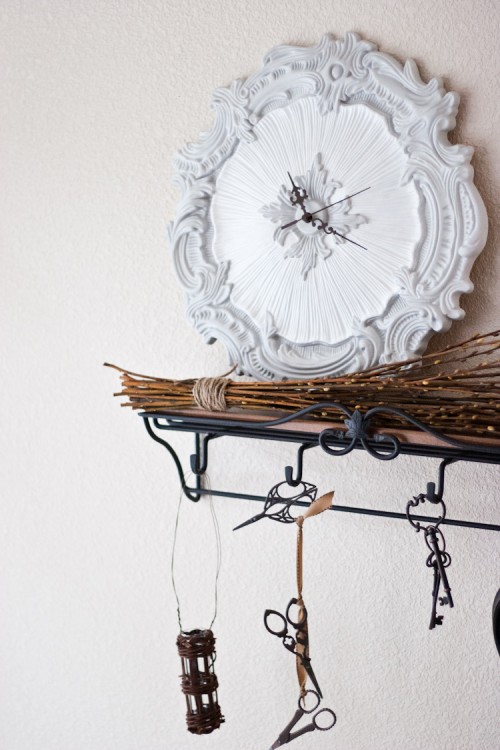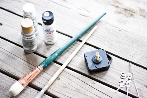 Ragasztópisztollyal rögzítsük az óraszerkezetet a rozetta hátuljára, majd szereljük fel az óramutatókat.