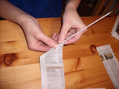 Ahogy a képen is látszik átlósan kell a csíkokat tekerni végig a hurkapálcán és, ami nagyon fontos, hogy jó szorosan tekerjük.