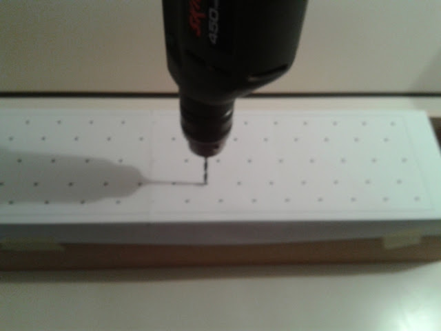 Ha szeretnénk hozzunk létre egy sablont a fúráshoz, ha nem akkor a fúró legkisebb fúrószárával furkáljuk ki a polc hátlapját szépen elrendezett mintában vagy ha nekünk úgy jobban tetszik akkor véletlenszerűen, ha nincs hátlapja akkor egy a polc méretével megegyező furnérlapot.