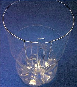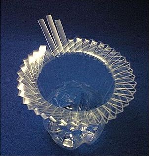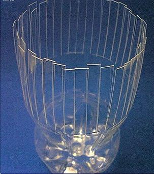 Először a kezünkkel hajlítsuk meg kifelé a felvágott flakon darabokat, majd fordítsuk fejjel lefelé és erősen lenyomva szintén kifelé hajlítjuk a felvágott darabokat.
