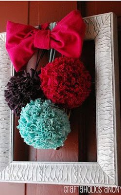 A pom-pom dekorációkat rögzítsük egy képkeret tetejének egy közepére, rögzítsünk rá egy szép masnit és kész is a gyönyörű dekorációnk!
