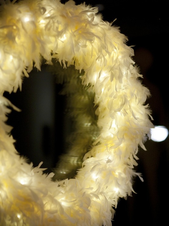 A koszorúalapra tekerjük fel a ledes izzósort néhény helyen cellux-al rögzítve, majd tekerjük fel rá a toll boa-t is.