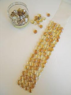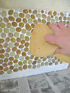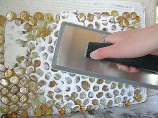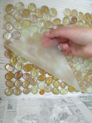 A fóliából akkora méretet vágunk le, amekkora mozaikcsempét szeretnénk készíteni, majd a ragasztóst felületét telenyomkodjuk az üvegkavicsokkal!