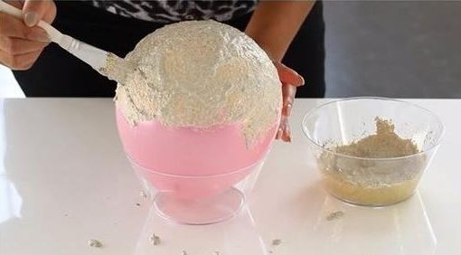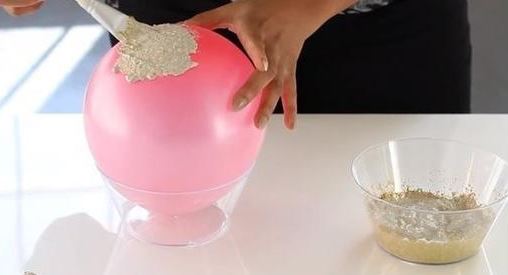 A lufit fújjuk fel, majd állítsuk szájával lefelé bele egy tálba, majd több rétegben (két réteg között meg kell várni a száradást) kenjük be kb. a feléig decoupage ragasztóval!