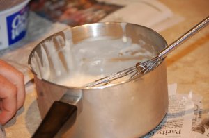 Fél csésze lisztet összekeverjük két csésze langyos vízzel! Közben két csésze vizet felforralunk és a tűzről levéve hozzáadjuk a lisztes keveréket! Újra felforraljuk folyamatos kevergetés mellett, majd a tűzről levéve hozzáadunk 3 evőkanál cukrot! Jól elkeverjük és megvárjuk, míg kihűl!