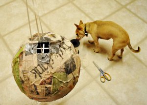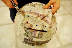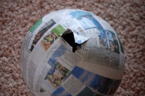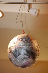 Felfújunk egy lufit erre papírcsíkokat borítunk, amit előzőleg csirizbe be is áztathatunk, majd kenünk rá egy adag papírpépet ezt még kb. háromszor megismételjük a rétegek közötti száradási időt kivárva!
