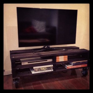 Száradás után pedig már csak az összeállítás maradt! A két fél darab raklapot összecsavarozzuk, aljára négy darab bútorgörgőt rögzítünk és már kész is a szuper TV állványunk!