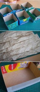 Egy müzlisdoboznak levágjuk az egyik oldalát, majd csomagolópapírt ragasztunk a belsejébe!