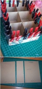 Kartonpapírból vagy egy másik dobozból kis rekeszeket csinálunk, amiket csomagolópapírral szintén körberagasztunk, majd ruhacsipeszekkel egymáshoz fogatva a ragasztó teljes száradásáig félretesszük!