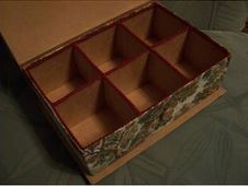 Dekoráljuk a dobozt szalvétával, dekorszalaggal, gyöngyökkel, flitterekkel vagy amihez épp kedvünk van, majd legvégül ragasszuk be a rekeszeket!