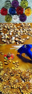 Ehhez csak annyit kell tennünk, hogy egy kartonpapírból készült kerek alapra felragasztjuk ragasztópisztollyal a pisztácia héjakat!