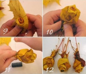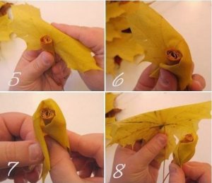 Így tovább haladva alakítjuk ki a szép rózsa formát, majd egy csokorba további le velekkel dekorálva csokrot alkotunk belőle!