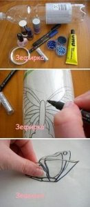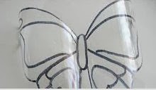 Levágjuk a palack nyakát és alját, majd a lepke sablon, amit netről kinyomtattunk a megfelelő mérteben belülről a palackhoz ragasszuk, hogy ne csusszon el!