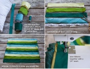 A szalagokat egyforma hosszú csíkokra vágjuk, majd azokat varrógéppel (kézzel is lehet csak kicsit több idő) egymáshoz varrjuk!