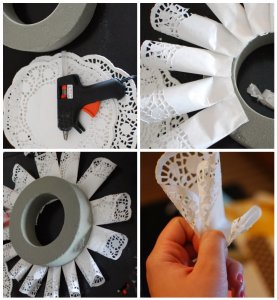 A tortapaírt felszeleteljük majd két szélét visszatekerve tölcsér formájúra formázzuk és a karikára több sorban felragasztjuk!