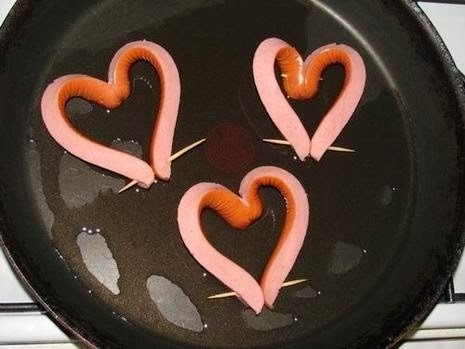 A virslit hosszában ketté vágjuk a végét egy kicsit meghagyva, majd kifelé fordítva a két végét összefogjuk egy fogpiszkálóval szív alakot formázva!