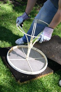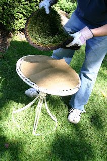 Tegyük le a gyepszőnyeget a földre, majd fejjel lefelé helyezzük rá az asztalt és egy éles késsel vagy sniccerrel vágjuk körbe a gyepszőnyeget az asztal mentén.
