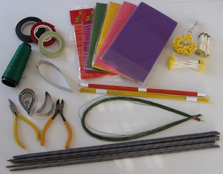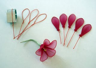 A virág összeállításához minden egyes szirmot, levelet cérnával rögzítünk egy több szálas drótalapra, ami a szára is lesz a virágnak!